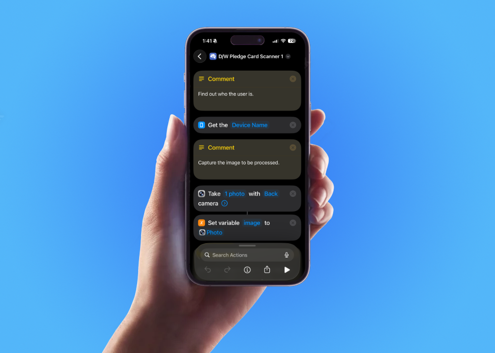 Behind the scenes, images were processed using AWS Textract, normalized via Lambda, and returned as structured JSON with confidence scores. On the device, the Shortcut guided users through confirming or correcting only the fields that actually needed attention, then pushed clean data directly into Rock via API, creating or updating records as appropriate.