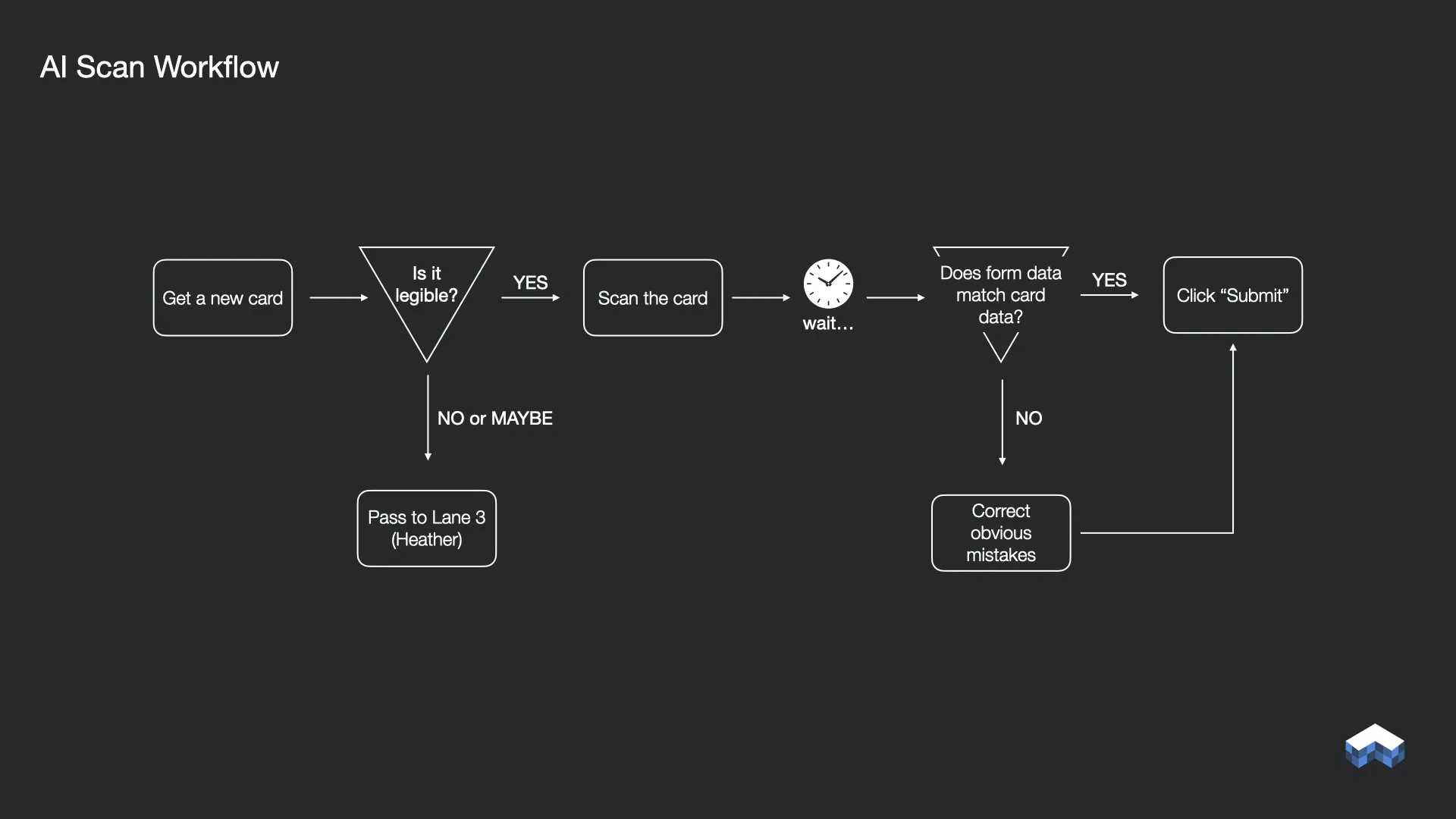 We knew AI-based scanning would be faster and less error-prone than manual entry, but we also knew it would never be perfect. The real design question wasn’t “Can AI read these cards?” It was “How do we design a workflow that knows when to trust automation and when to defer to a human?”